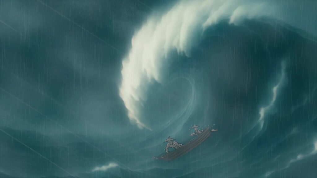 このお話は、富山県黒部市に伝わる海の民話です。富山湾では、暴風によって日本海北部で発生した波がうねりを伴って湾内に侵入することがあります。局所的に波が高くなったり、風や波が落ち着いた頃に不意に打ち寄せることもあり、昔から多くの海難事故が発生しています。作中に描かれた享徳三年の事故を受け、見晴らしのきく場所に常灯明が設けられ、現在でも海難事故防止のシンボルとして「槍が崎灯明台」が、海の安全を見守っています。海への恐れを忘れてはならないことを思い起こさせてくれる民話です。