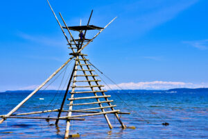 海上に建てたやぐらの上でボラの群れを見張り、網に入るのをじっと待つ漁法で使われていました。最盛期には40基ほどありましたが、1996年秋を最後にこの漁法で漁をする人はいなくなり、現在は観光用に建てられた4基のやぐらを見ることができます。