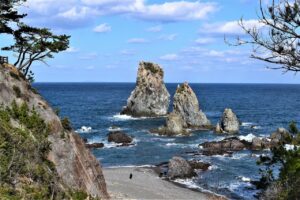 日本海の荒波が生み出した奇岩や断崖が連なる景勝地で、「海上アルプス」とも呼ばれています。北長門海岸国定公園の中心的スポットで、観光遊覧船や島内散策でダイナミックな海岸の美しさを楽しめます。透明度の高い海では海水浴やダイビングなどができ、自然を体感できる観光スポットとして親しまれています。