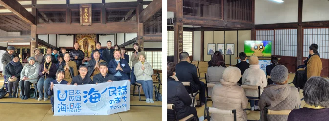 同日の午後には、民話の舞台となった青海島の西圓寺にて上映会を実施し、地域住民約20名が参加しました。