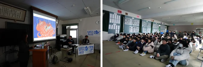 続いて、日間賀島観光協会の宮地達さんからは、島ならではの豊かな海の幸や美しい風景といった魅力が語られる一方で、海ごみ問題やその対策として地域で行われているごみ拾い活動についても紹介されました。子どもたちは、自分たちの暮らす島の自然を守る取り組みを身近に感じ、民話やアニメを通して海と地域のつながりについて理解を深める貴重な時間となりました。