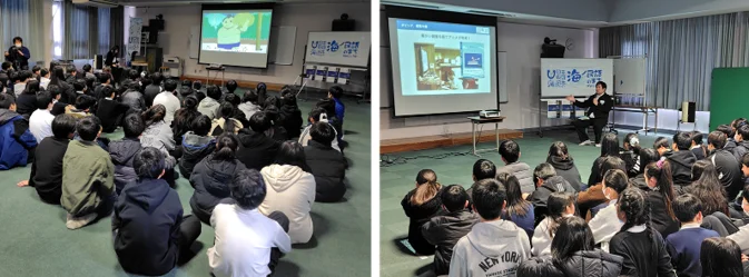地元の守山市立速野小学校にて上映会が開催され、6年生約90名が参加しました。アニメの上映後には、沼田監督が登壇し、アニメ制作の舞台裏や監督という仕事の魅力について、児童たちへ特別解説を行いました。約5分間のアニメを完成させるためにも、約6ヵ月間もの期間を費やしたことなど、制作にかけられる膨大な時間と緻密な工程の紹介に、児童たちは関心を持って聞き入っていました。
