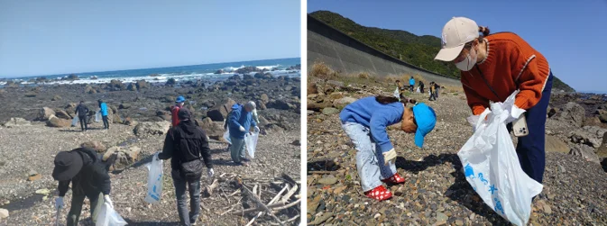 イベントの締めくくりには、会場前の海岸にて清掃活動を実施しました。アニメや講演を通じて、室戸の海の恵みを再確認した直後ということもあり、参加者の皆さんは「海を大切にする心」と「感謝の気持ち」を込め、一つひとつ丁寧にごみを拾い集めていました。