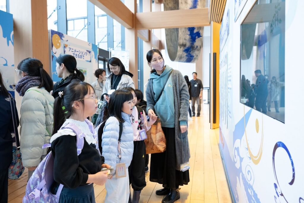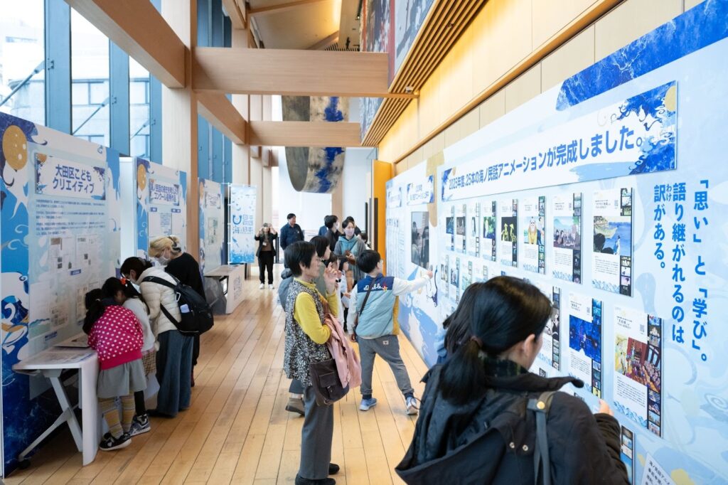 ▼アニメの原画や海ノ民話を活用した作品を展示。子どもも大人も興味深く見学していました。
