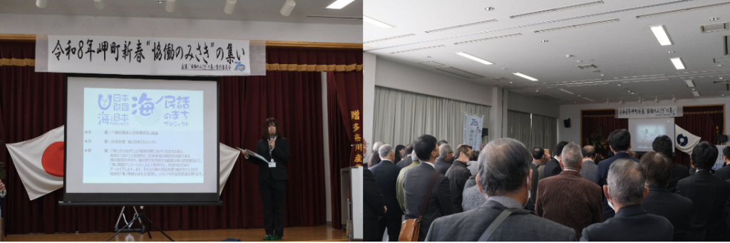 町内の各種団体、岬町議会議員、行政委員等が年のはじめに一堂に会し、意見交換を行う機会である“協働のみさき”の集いにおいて、アニメ『福姫伝説』のお披露目を行うとともに、プロジェクトの内容や背景を説明することで、今後のアニメ活用について協力を呼びかけました。