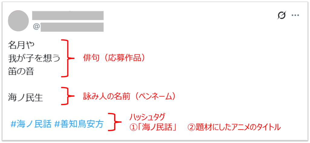 (3)Xにて、「俳句(応募作品)」と「詠み人の名前(ペンネーム)」に、2つのハッシュタグ「#海ノ民話」と「#(題材にしたアニメのタイトル) 」の付けて投稿