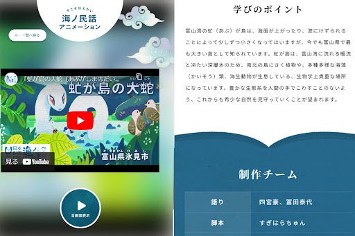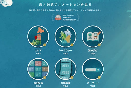 リニューアル時点で42本(今年度中に67本)ある全国の海ノ民話アニメーションを、「エリア」「登場キャラクター」「海の学びのテーマ」「演出担当(クリエイター)」などで分類し、作品との出会いがより身近になりました。